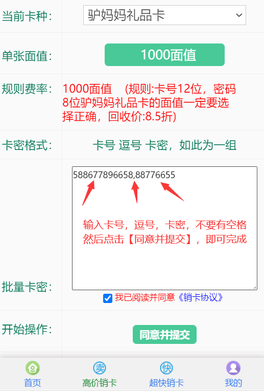 然后输入卡号,逗号,卡密,不要有任何空格,点击【同意并提交】,即可完成。