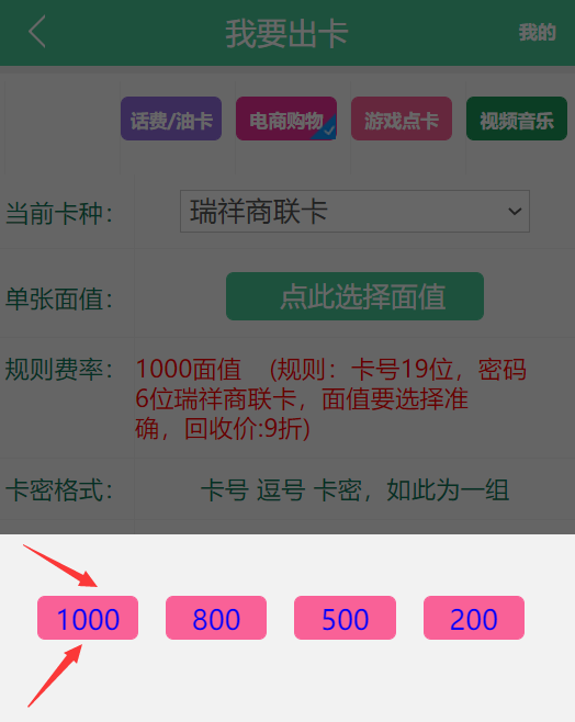 先下拉回到本页面头部,点击【我要卖卡】,如下图:
