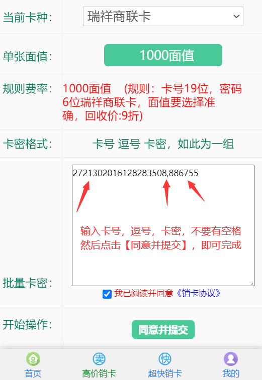 然后输入卡号,逗号,卡密,不要有空格,点击【同意并提交】,如下图: