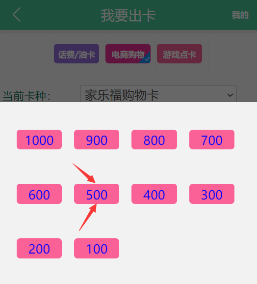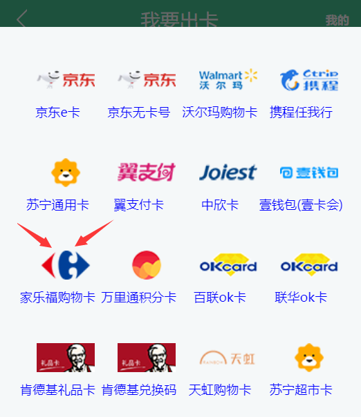 具体如何操作呢?先下拉回到头部,点击【我要卖卡】,如下图: