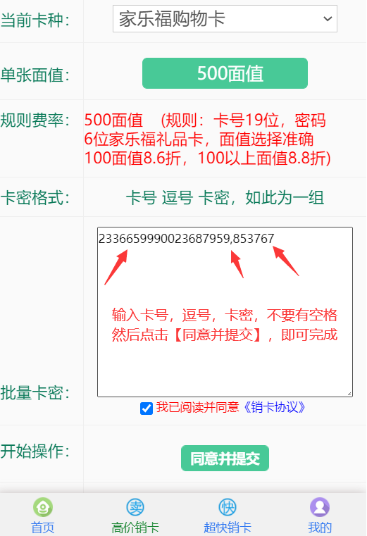 最后输入卡号,逗号,卡密,不要有空格,点击【同意并提交】,即可。如下图: