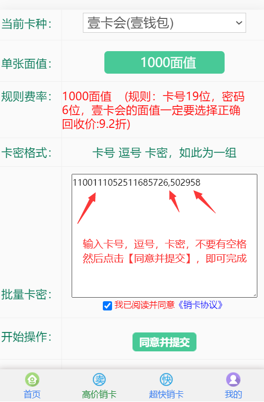 然后输入卡号,逗号,卡密,不要有空格,点击【同意并提交】,如下图: