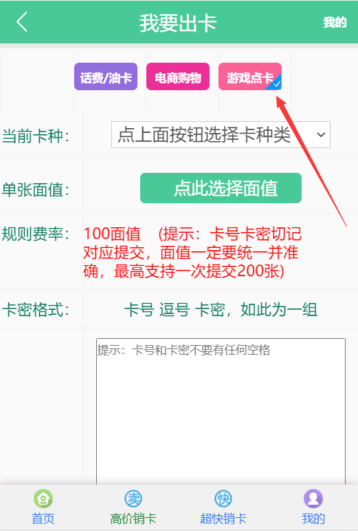 最后选择好面值,输入卡号,逗号,卡密,不要有空格,点击【同意并提交】,即可。回收价格,在选择卡的种类之后,就会出来提示,可以看到具体的回收折扣的。成交后再申请提现,如有疑问,还可以咨询客服。