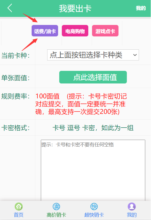 最后选择好面值,输入卡号,逗号,卡密,不要有空格,点击【同意并提交】,即可。回收价格,在选择卡的种类之后,就会出来提示,可以看到具体的回收折扣的。成交后再申请提现,如有疑问,还可以咨询客服。