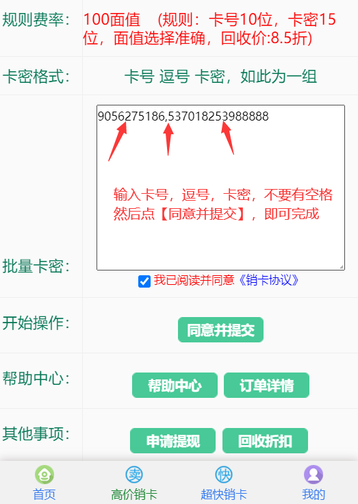 最后输入卡号,逗号,卡密,不要有空格,点击【同意并提交】,即可。