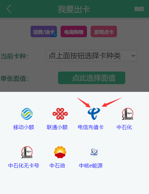 以移动话费充值卡为例,找到【电信充值卡】,点进去,如下图: