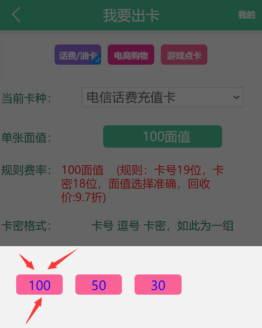请下拉回到本页面头部,点击【我要卖卡】,如下图: