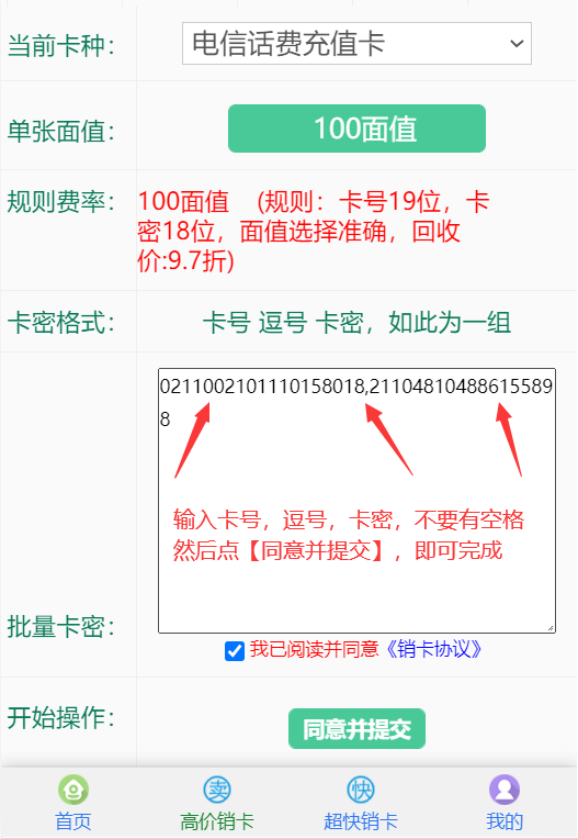 然后输入卡号,逗号,卡密,不要有任何空格,点击【同意并提交】,即可完成。